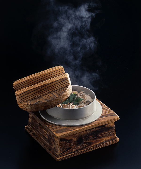釜飯の釜に細工して湯気を人工的に入れて撮影を行いました。